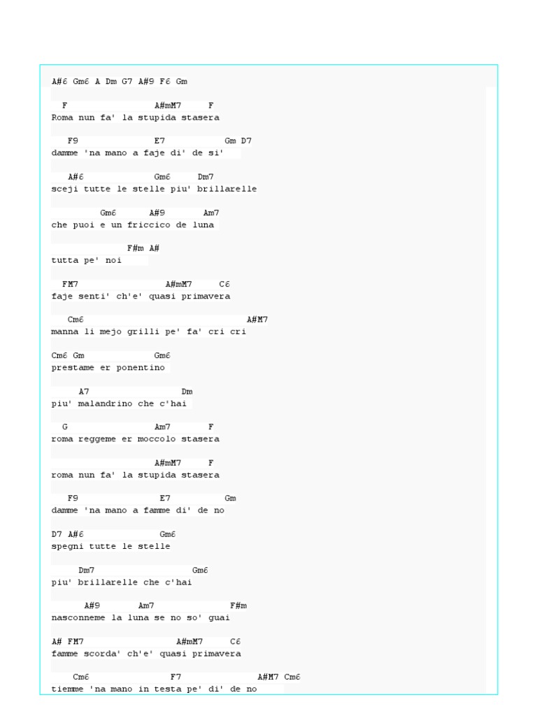 Faje sentì ch'è quasi primavera manna li mejo grilli pe' fa cri cri. Am7 d7 sceji tutte le stelle am7 d7 piu' brillarelle che c'hai am7 d7 g c d e un friccico de luna tutta pe' noi g b7 g faje senti' ch'e' quasi primavera g b7 c b7 e7 manna li mejo grilli pe' fa' cri cri am7 d7 prestame. Prestame er ponentino più malandrino che c'hai. Le stelle piu' brillarelle che c'hai e un friccico de luna tutta per noi faje senti' ch'e' quasi primavera manna li mejo grilli pe fa' cri cri prestame er ponentino piu' malandrino che c'hai roma reggeme er moccolo stasera roma nun fa' la stupida. Roma nun fà la stupida stasera. Famme scordà che è quasi primavera tiemme 'na mano 'n testa pe' dì de no smorza quer venticello stuzzicarello che c'hai roma nun fa' la stupida. See more of roma nun fa' la stupida stasera on facebook. Roma, nun fa' la stupida stasera damme 'na mano a famme di' de no, spegni tutte le stelle. Roma nun fa' la stupida stasera. Sceji tutte le stelle più brillarelle che poi e un friccico de luna tutta pe' noi. Comment must not exceed 1000 characters. Er ponentino am7 d em piu' malandrino che c'hai am d g roma reggeme er moccolo. Pietro garinei, sandro giovannini, armando trovajoli.